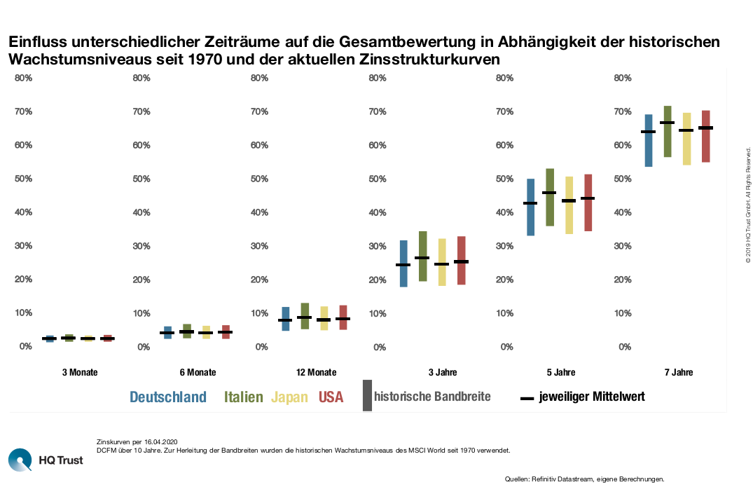 Im Rahmen seiner Analyse hat sich der Senior Analyst von HQ Trust angeschaut, wie stark sich mögliche Gewinnausfälle auf den langfristigen Wert einer Aktie auswirken. Basis seiner Berechnung ist das Discounted Cash Flow-Modell über die kommenden zehn Jahre. Um das Wachstum der Unternehmen einzuschätzen, verwendet Maximilian Kunz die Gewinnentwicklung der Unternehmen aus dem MSCI World seit dem Jahr 1970. Zudem berücksichtigt er das aktuelle Zinsniveau verschiedener Länder.